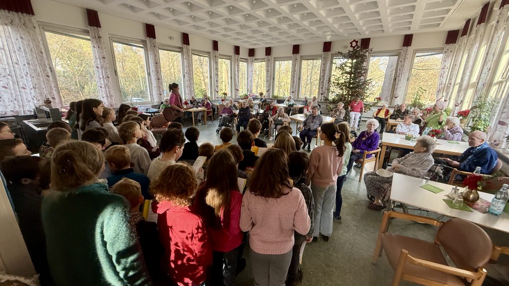 Nach dem ersten Auftritt um 10:00 Uhr im großen Speisesaal ging es um 10:30 Uhr weiter in den Pflegebereich, damit auch die Bewohnerinnen und Bewohner dort das Weihnachtssingen erleben konnten. Für die Kinder war es eine besondere Erfahrung, ihre Lieder in einem so persönlichen Rahmen vortragen zu dürfen. Gleichzeitig war deutlich zu spüren, wie sehr sich die Seniorinnen und Senioren über den Besuch freuten.