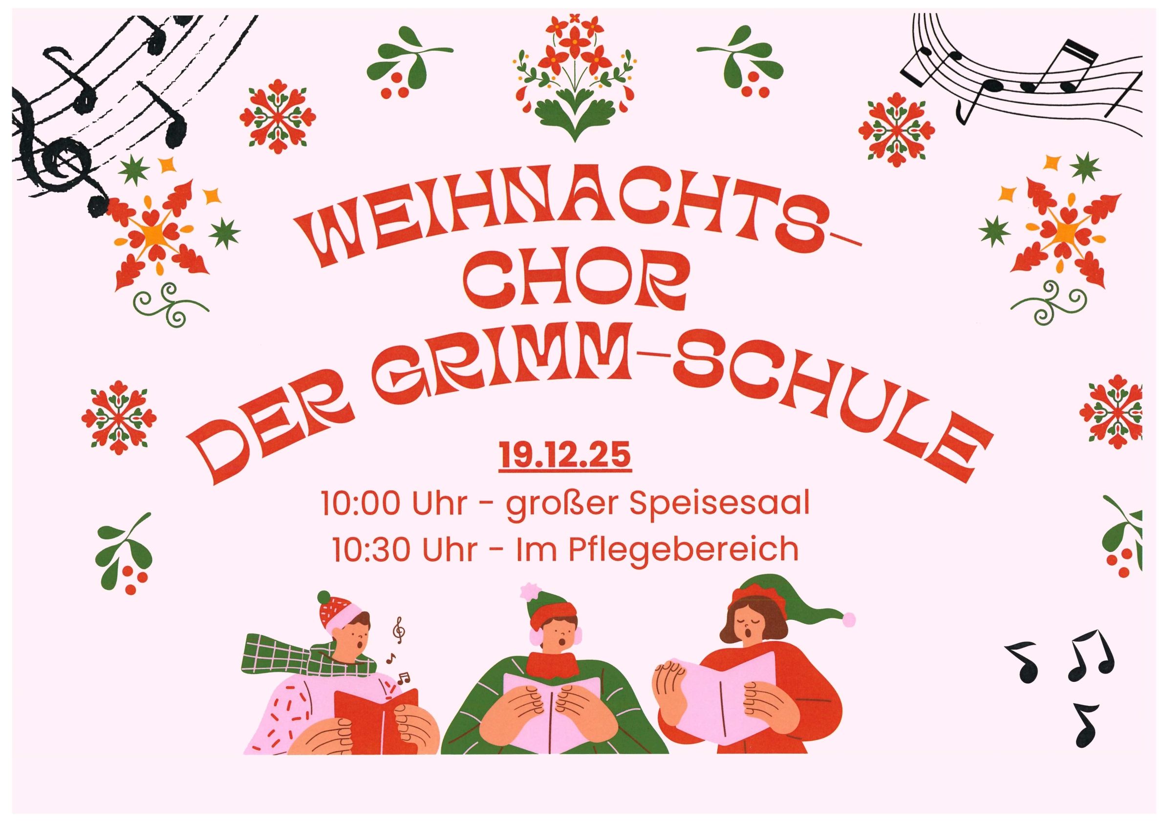 Eröffnet wurde das Singen mit dem Schullied unserer Grimmschule. Schon bei den ersten Tönen war zu merken, wie aufmerksam und berührt die Zuhörerinnen und Zuhörer im großen Speisesaal lauschten. Im Anschluss präsentierten die Kinder ein abwechslungsreiches Programm, das viele bekannte Melodien beinhaltete: „Feliz Navidad“, „Lichterkinder“, „Jingle Bells“ und „In der Weihnachtsbäckerei“ sorgten für eine festliche Stimmung und luden zum Mitwippen, Mitsummen und Mitlächeln ein. Zum Abschluss erklang „Kling Glöckchen klingelingeling“ und rundete das kleine Konzert stimmungsvoll ab.